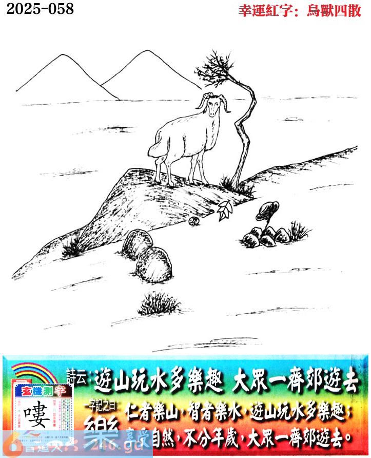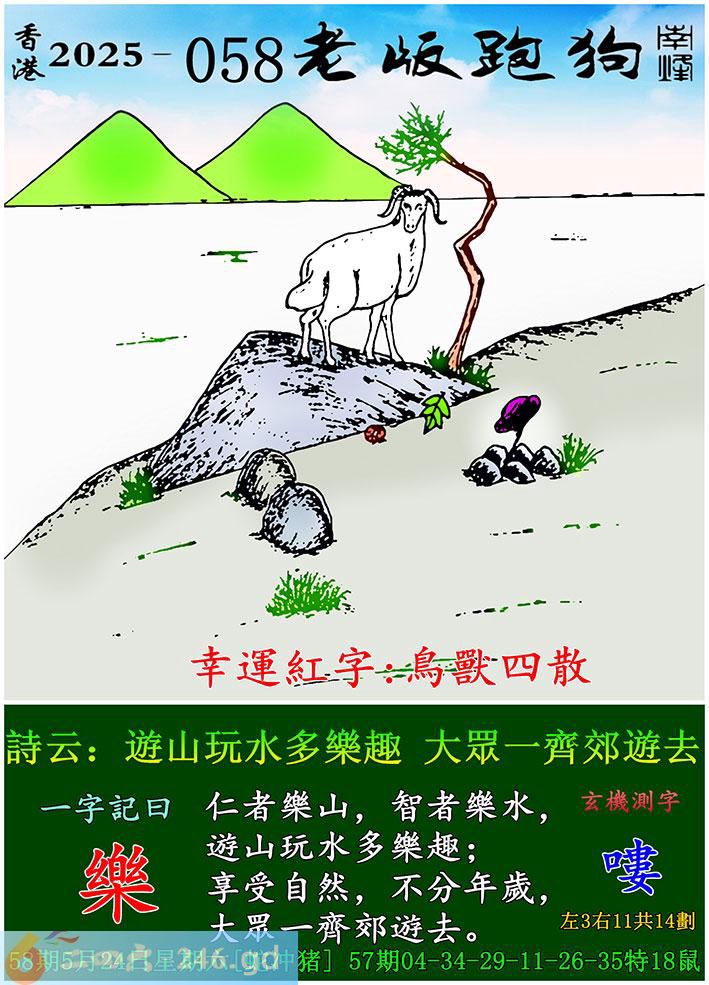058期老版跑狗一字記之曰:【樂】 詩雲:遊山玩水多樂趣,大眾一齊郊遊去。