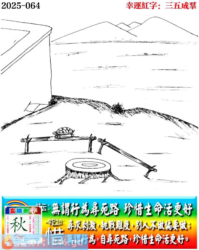 064期老版跑狗一字記之曰:【惜】 詩雲:無謂行為尋死路,珍惜生命活更好。