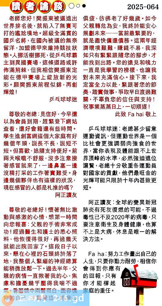 〖乒乓球球迷〗:老總甚少留意運動資訊,但運動世界是一個比社會更強調弱肉強食的世界,當你表現及體能跟不上世界頂峰的水準,必然強迫退位讓賢,老總十分敬重各運動員對國家的貢獻,他們最旺金的光輝可能只限於十年內甚致更短。