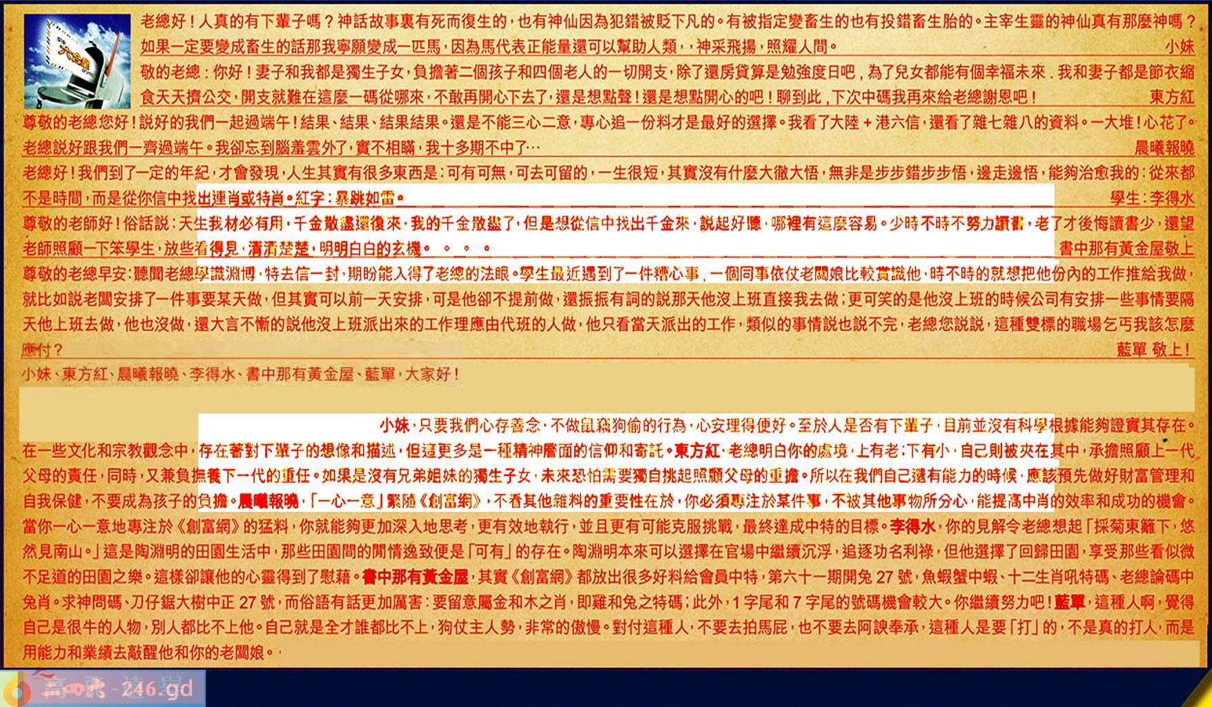 【3】.尊敬的老總您好!說好的我們一起過端午!結果、結果、結果結果。還是不能三心二意,專心追份料才是最好的選擇。我看了大陸港六信,還看了雜七雜八的資料。一大堆!心花了。老總說好跟我們一齊過端午。我卻忘到腦羞雲外了,實不相瞒我十多期不中了...晨曦報曉