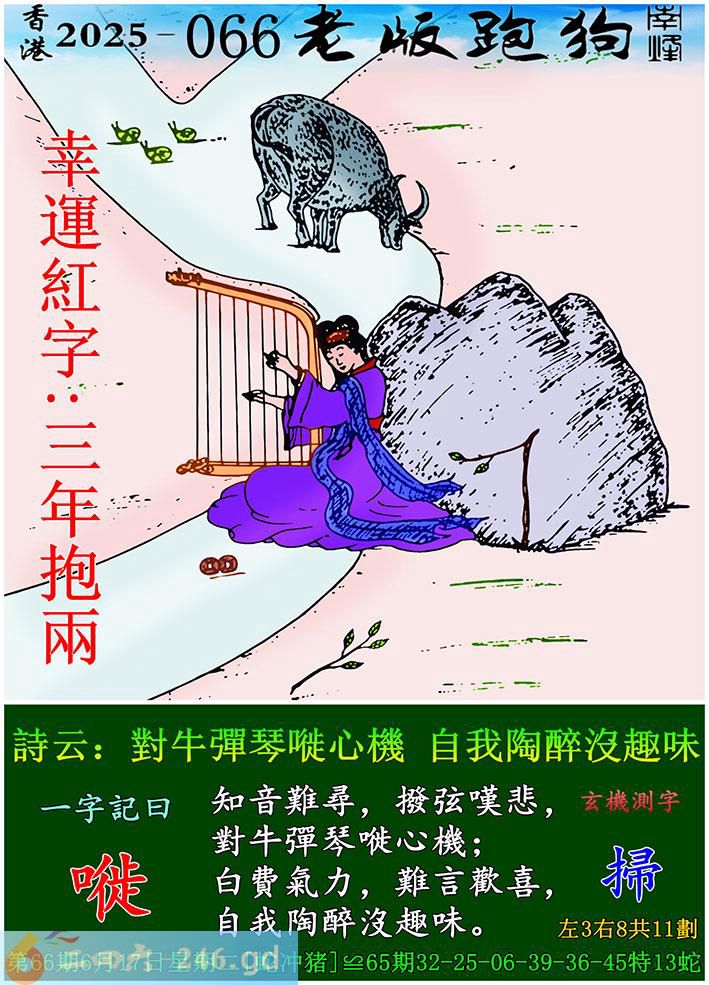 066期老版跑狗一字記之曰:【嘥】 詩雲:對牛彈琴嘥心機,自我陶醉沒趣味。