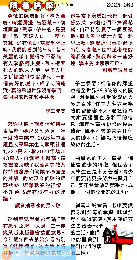 2.感謝貼總上期登信解惑中東局勢!轉眼又到六月一年一度的畢業季,2025年中國應屆大學畢業生人數預計達1,222萬人,較2024年增加43萬人,再創歷史新高。這項數據反映了我國高等教育的持續發展和就業市場面臨的挑戰。對於現今低迷的經濟狀態,與難就業的行情,不知道貼總有沒有好的建議?讀者抽黑冰的男人敬上