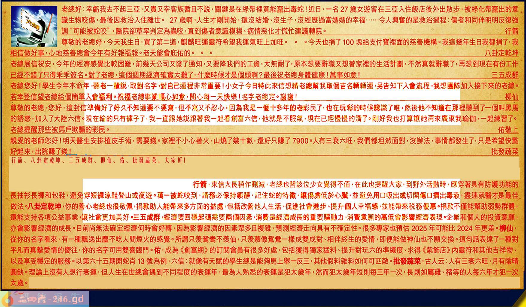 第070期《六合皇信箱文字版》10000%正確!!!正版二四六論壇*精心製作!!! 行箭、八卦定乾坤、三五成群、柳仙、佑、批發蔬菜,大家好! 【1】.老總好:幸虧我去不起三亞,又贵又宰客族暫且不說,關鍵是在綠帶裡竟能竄出毒蛇!近日,一名27歲女遊客在三亞入住飯店後外出散步,被綠化帶竄出的意識生物咬傷,最後因救治入住離世。27歲啊,人生才剛開始,還沒結婚、沒生子,沒經歷過當媽媽的幸福......令人興奮的是救治過程:傷者和同伴明明反復強調“可能被蛇咬”,醫院卻草率判定為蟲咬,直到傷者意識模糊、病情惡化才慌忙建議轉院。行箭 〖行箭〗:來信太長稍作刪減,老總也替該位少女覺得不值,在此也提醒大家,到野外活動時,應穿著具有防護功能的長袖衫長褲和包鞋,避免穿短褲涼鞋登山或夜遊。蔼一被蛇咬到,請務必保持鎮靜,記住蛇的特徵,讓傷處低於心臟,並避免用口吸出或切開傷口擠出毒液,盡速就醫才是最佳做法。 【2】.尊敬的老總好,今天我生日,買了第二道,麒麟旺運靈符希望我運氣旺上加旺。。。今天也捐了100塊給支付寶裡面的慈善機構。我這幾年生日我都捐了,我相信做好事心地慈善總會今年有好報福報。老天爺會庇佑的。。。八卦定乾坤 〖八卦定乾坤〗:你的善心老總也很敬佩,捐款助人能帶來多方面的益處,包括改善他人生活、促進社會進步、提升個人幸福感,並能帶來税務優惠。捐款不僅能幫助弱勢群體,還能支持各項公益事業讓社會更加美好。 【3】.老總展信祝安,今年的經濟感覺比較困難,前幾天公司又發了通知又要降我們的工資,太無耐了,原本想要辭職又想著家裡的生活計劃,不然真就辭職了,再想到現在有份工作已經不錯了只得乖乖簽名。對了老總,這個週期經濟確實太難了,什麼時候才是個頭啊?最後祝老總身體健康!萬事如意!三五成群 〖三五成群〗:經濟要回穩起碼靄要兩個因素,消费是經濟成長的重要驅動力。消費意願的高低會影響經濟表現。企業和個人的投資意願亦會影響經濟的成長。目前尚無法確定經濟何時會好轉,因為影響經濟的因素眾多且複雜,預測經濟走向具有不確定性。很多專家也預估2025年可能比2024年更差。 【4】.老總您好!學生今年本命年,聽老一輩說,取對名字,對自己運程非常重要!小女子今日特此來信想請老總幫我取個吉名轉轉運,另告知下入會流程,我想團隊加入接下來的老總。若幸登信望老總給個簡單入會福利。祝福老總事業順心如意,開心每一天快樂!名字老總定。謝謝!柳仙 〖柳仙〗:從你的名字看來,有一種飄逸出塵不吃人間煙火的感覺。所謂只羨鴛鴦不羨仙,只羨慕像鴛鴦一樣成雙成對、相伴終生的愛情,即便能做神仙也不願交换。這句話表達了一種對平凡而真摯愛情的臠往,你的名字可用雙喜臨門。 【5】.尊敬的老總,您好,這封信準備好了好久不知道要不要寫,但不寫又不忍心,因為我是一個十多年的老彩民了,也在玩彩的時候認識了唯,然後他不知道在那裡聽到了一個叫黑馬的誘惑,加入了大陸六信。現在輸的只有褲子了,我一直跟她說跟著我-起石創富六信,他就是不服氣,現在已經慢慢的清了。剛好我也打算讓她再來廣東我瑜伽,一起練習了。老總提醒那些被馬戶欺騙的彩民。佑敬上 〖佑〗:成為《創富網》的訂閱會員有很多好處,包括獲得獨家猛料、提升對玩六的準繩度、求得《紫飾店》內靈符和其他吉祥物、以及享受穩定的服務。以第六十五期開蛇肖13號為例,六信:就像有天賦的學生總是能夠馬上舉一反三,其他假料雜料如何可匹敵。 【6】.親愛的老師您好!明天醫生安排植皮手術,需要錢。家裡不小心著火,山燒了幾十畝,還好只賺了7900。人有三衰六旺,我們都坦然面對,沒辦法,事情都發生了,只是希望快點好起來,出院賺了錢!批發蔬菜 〖批發蔬菜〗:古人云:人有三衰六旺,月有陰晴圓缺。理論上沒有人想行衰運,但人生在世總會遇到不同程度的衰運年,最為人熟悉的衰運是犯太歲年,然而犯太歲年短則每三年一次,長則如屬雞、豬等的人每六年才犯一次太歲。 紅字:恐後爭先 暗码:01213849 [释义]指害怕落后,追求上进。 [出处]清·吴趼人《二十年目睹之怪现状》第68回:“他却横冲直撞,恐后争先。”