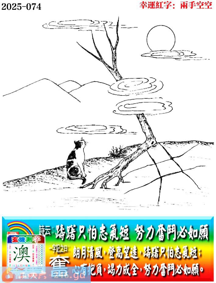074期老版跑狗一字記之曰:【奮】 詩雲:躊躇只怕志氣短,努力奮鬥必如願。