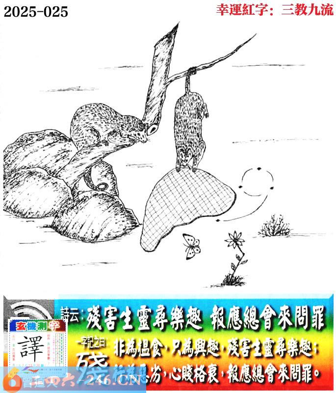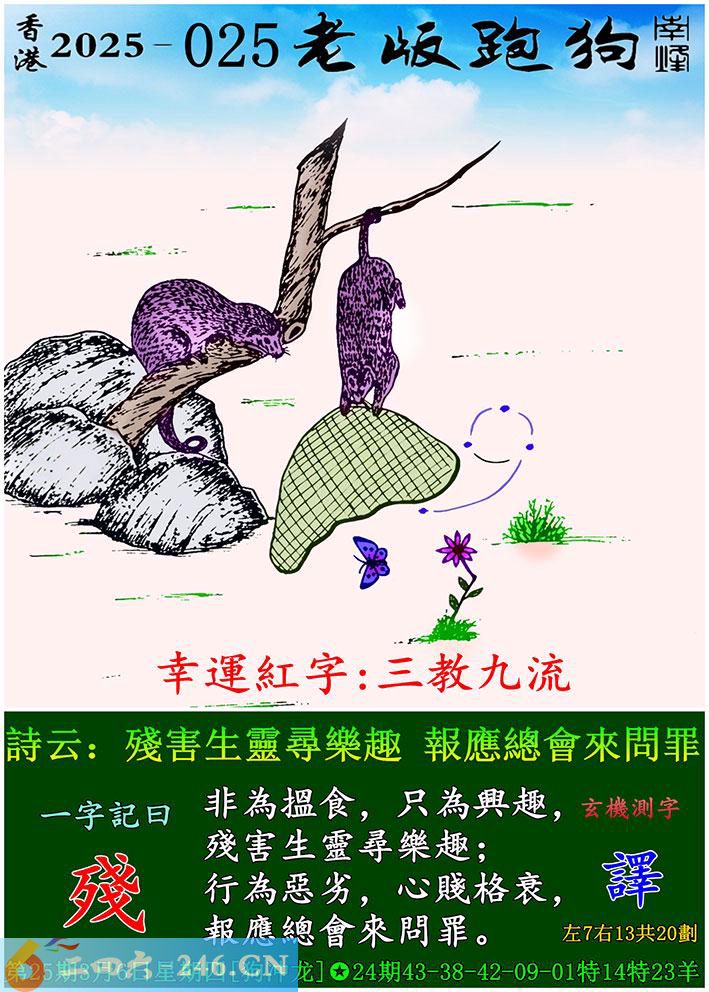 025期老版跑狗一字記之曰:【殘】 詩雲:殘害生靈尋樂趣,報應總會來問罪。