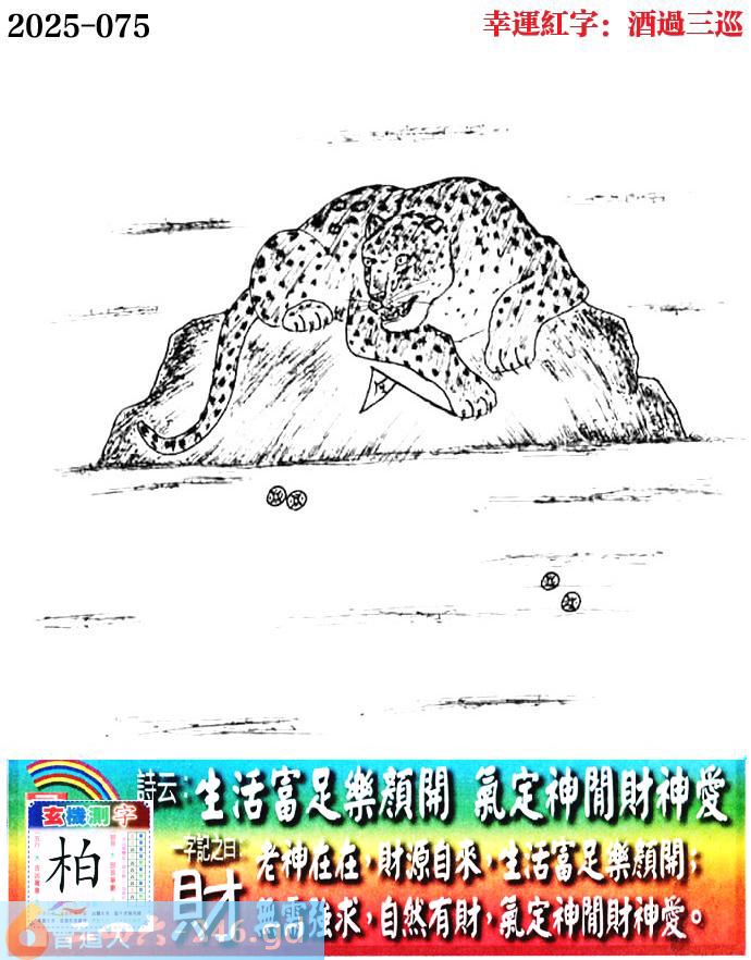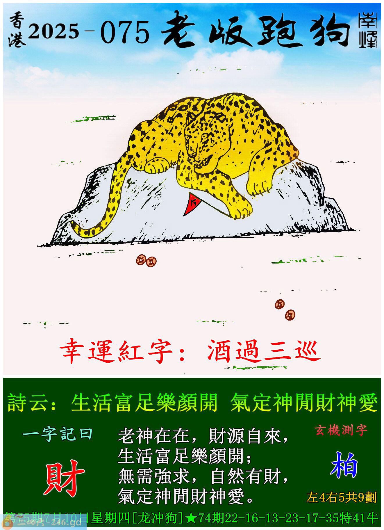 075期老版跑狗一字記之曰:【財】 詩雲:生活富足樂顏開,氣定神閒財神愛。