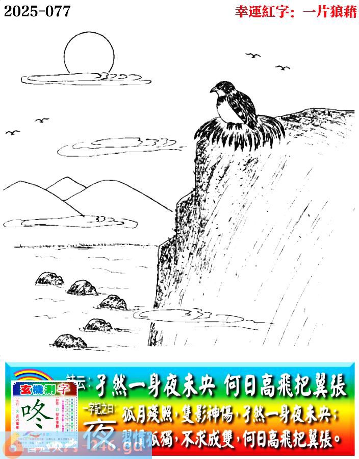 077期老版跑狗一字記之曰:【夜】 詩雲:孑然一身夜未央,何日高飛把翼張。