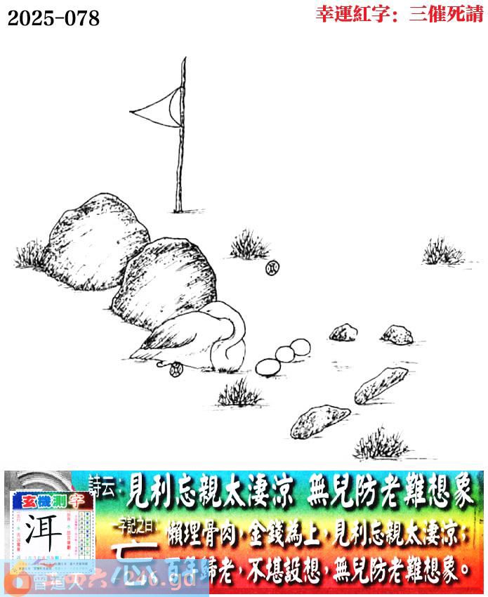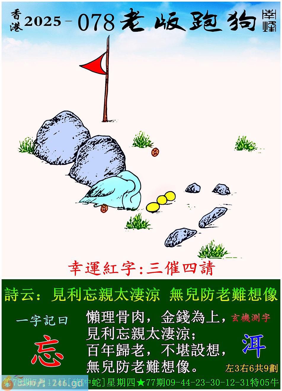 078期老版跑狗一字記之曰:【忘】 詩雲:見利忘親太淒涼,無兒防老難想像。
