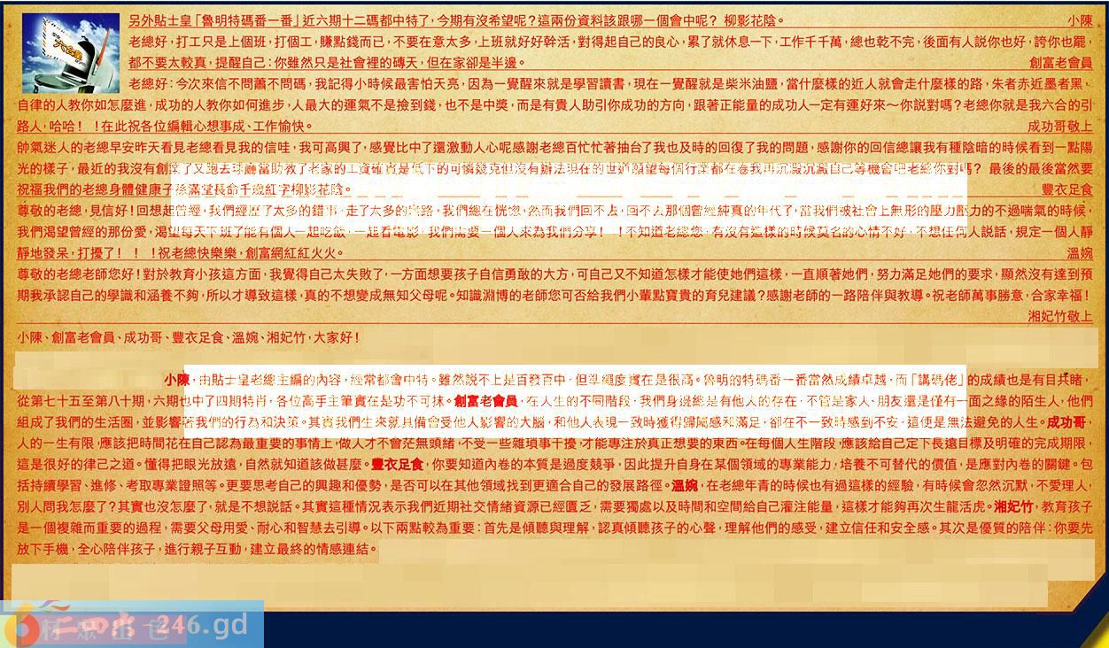【3】.老總好:今次來信不問蕭不問碼,我記得小時候最害怕天亮,因為一覺醒來就是學習讀書,現在一覺醒就是柴米油鹽,當什麼樣的近人就會走什麼樣的路,朱者赤近墨者黑,自律的人教你如怎麼進,成功的人教你如何進步,人最大的運氣不是撿到錢,也不是中獎,而是有貴人助引你成功的方向,跟著正能量的成功人一定有運好來你說對嗎?老總你就是我六合的引路人,哈哈!!在此祝各位編輯心想事成、工作愉快。成功哥敬上