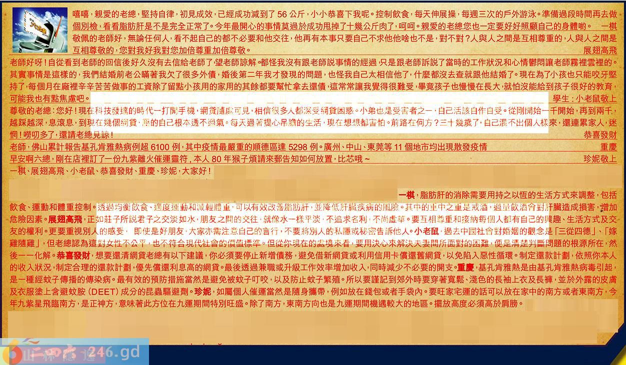 【3】.老師好呀!自從看到老師的回信後好久沒有去信給老師了望老師諒解。嘟怪我沒有跟老師說事情的經過,只是跟老師訴說了當時的工作狀況和心情鬱悶讓老師霧裡雲裡的。其實事情是這樣的,我們結婚前老公瞞著我欠了很多外債,婚後第二年我才發現的問題,也怪我自己太相信他了,什麼都沒去查就跟他結婚了。現在為了小孩也只能咬牙堅持了每個月在廠裡辛辛苦苦做事的工資除了留點小孩用的家用的其餘都要幫忙拿去還債,這常常讓我覺得很難受,畢竟孩子也慢慢在長大,就怕沒能給到孩子很好的教育,可能我也有點焦慮吧。學生:小老鼠敬上