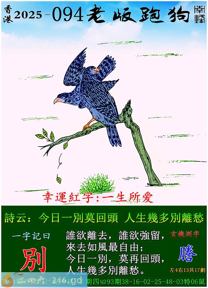 094期老版跑狗一字記之曰:【別】 詩雲:今日一別莫回頭,人生幾多別離愁。