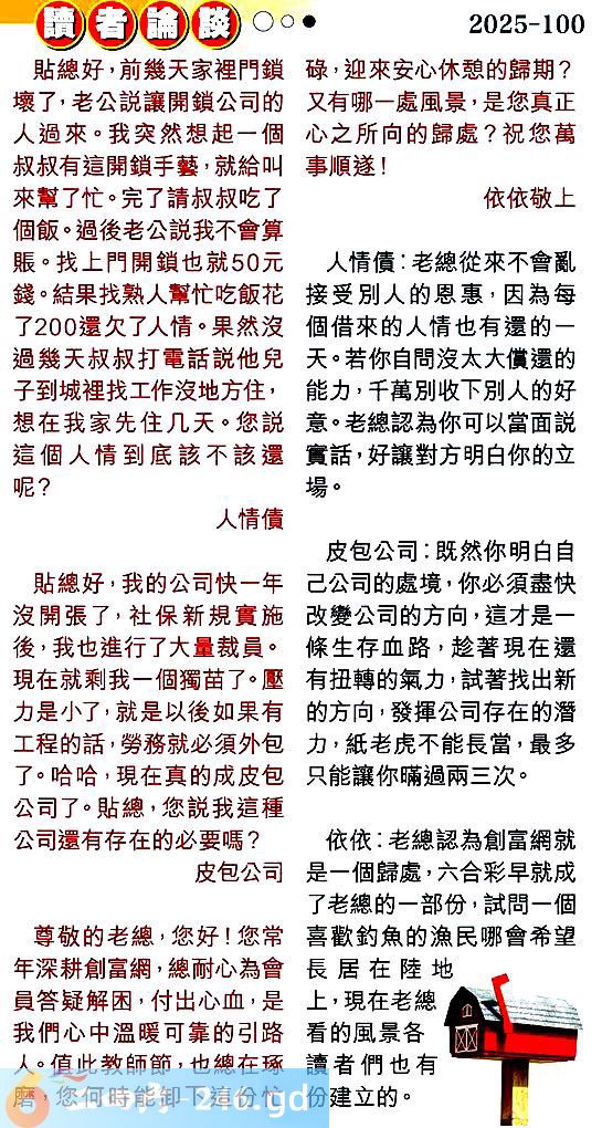 〖依依〗:老總認為創富網就是一個歸處,六合彩早就成了老總的一部份,試問一個喜歡釣魚的漁民哪會希望長居在陸地上,現在老總看的風景各讀者們也有份建立的。