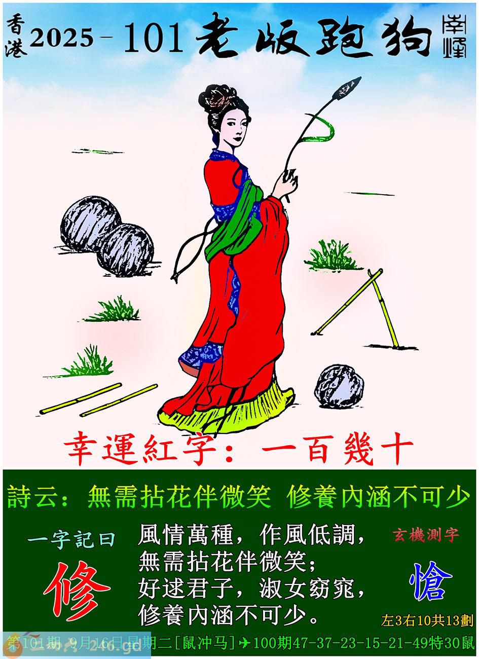 101期老版跑狗一字記之曰:【修】 詩雲:無需拈花伴微笑,修養內涵不可少。