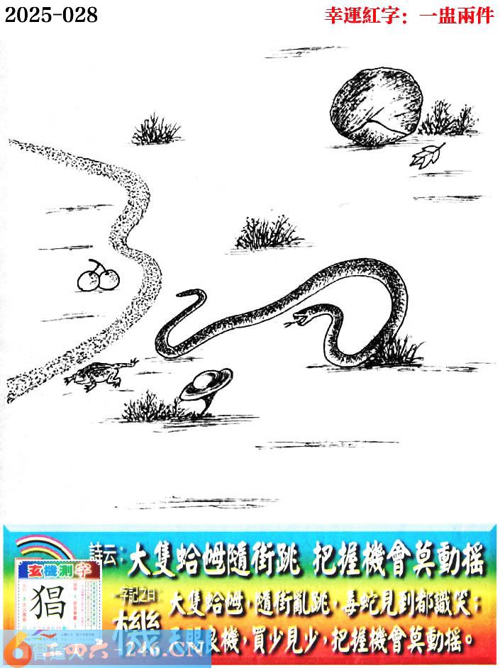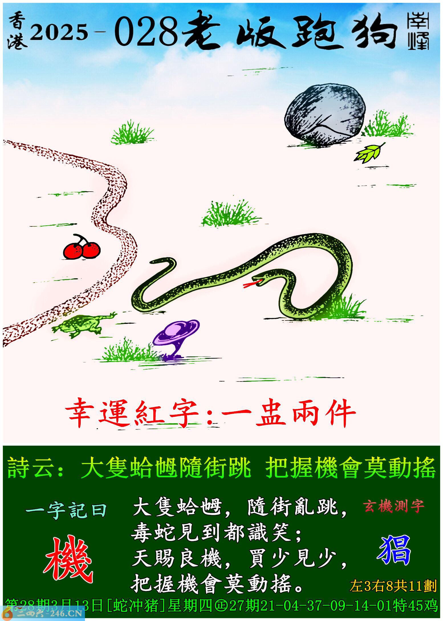 028期老版跑狗一字記之曰:【機】 詩雲:大隻蛤乸隨街跳,把握機會莫動搖。