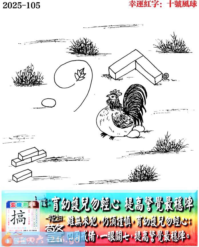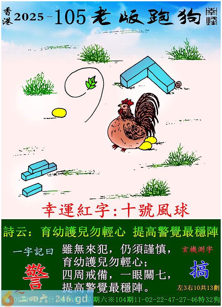 105期老版跑狗一字記之曰:【警】 詩雲:育幼護兒勿輕心,提高警覺最穩陣。
