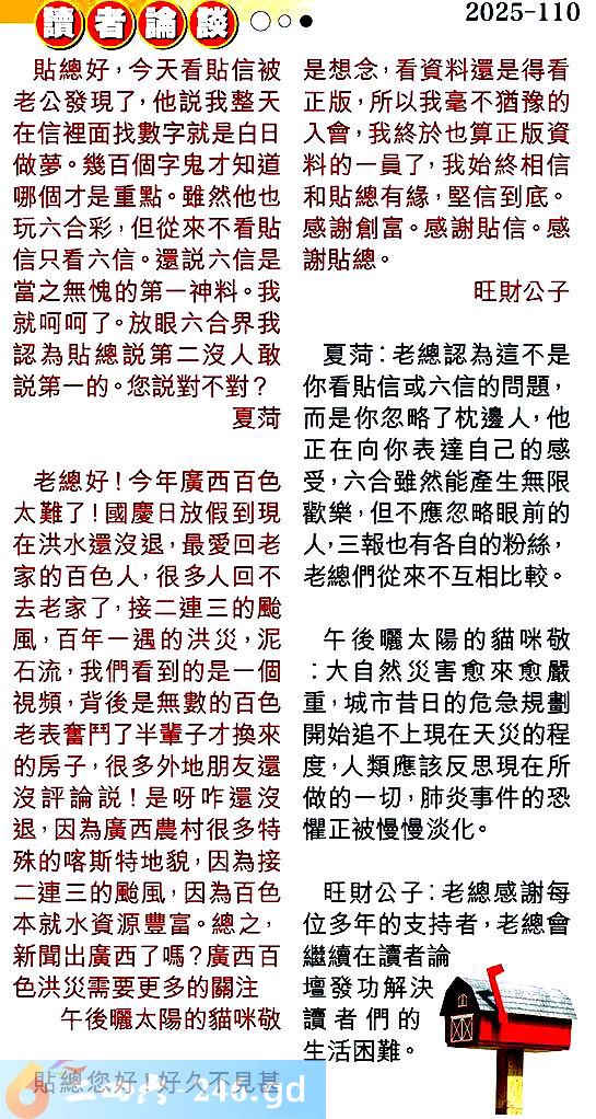 110期:彩民推荐〖貼信讀者論壇〗
