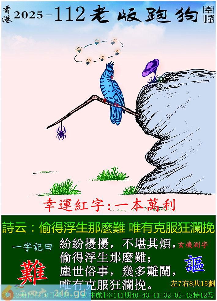 112期老版跑狗一字記之曰:【難】 詩雲:偷得浮生那麼難,唯有克服狂瀾挽。