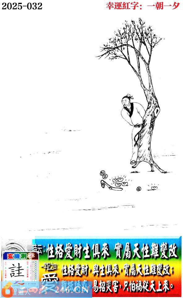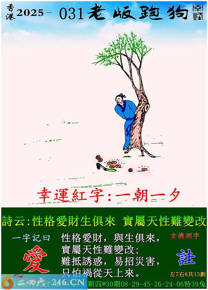 031期老版跑狗一字記之曰:【愛】 詩雲:性格愛財生俱來,實屬天性難變改。