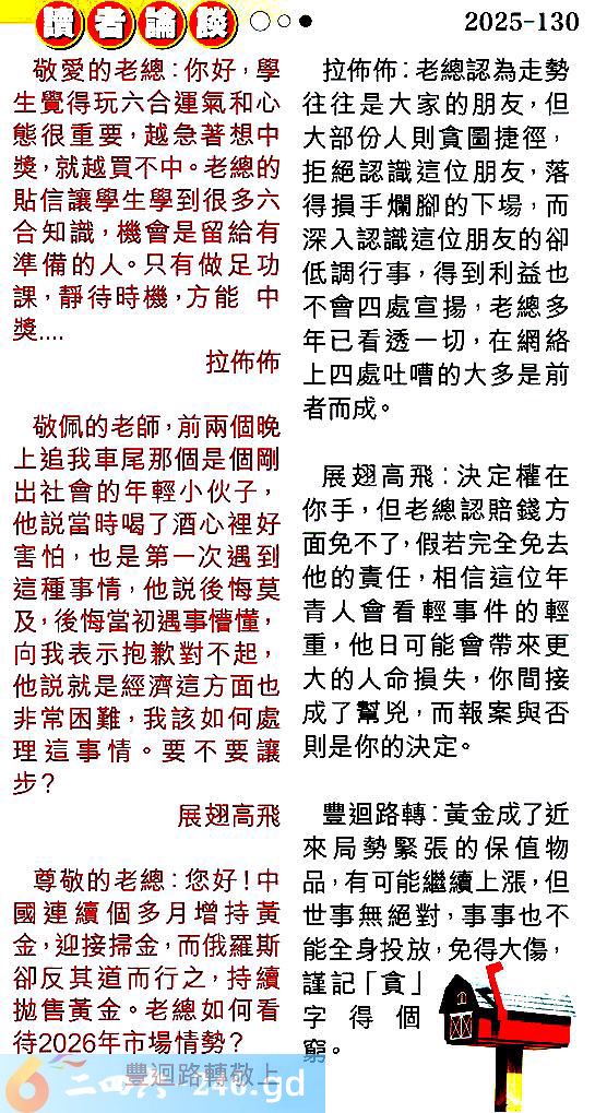 1.敬愛的老總:你好,學生覺得玩六合運氣和心態很重要,越急著想中獎,就越買不中。老總的貼信讓學生學到很多六合知識,機會是留給有準備的人。只有做足功課,靜待時機,方能中獎....拉佈佈
