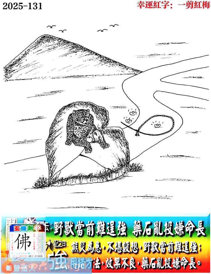 131期老版跑狗一字記之曰:【強】 詩雲:野獸當前難逞強,藥石亂投嫌命長。