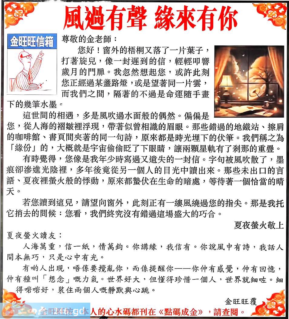 131期:金旺旺信箱彩民推荐→→《風過有聲 緣來有你》