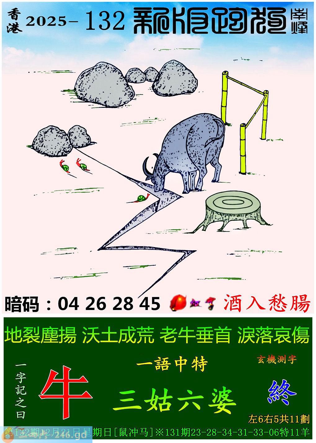 132期跑狗一字記之曰:【牛】 地裂塵揚,沃土成荒。 老牛垂首,淚落哀傷