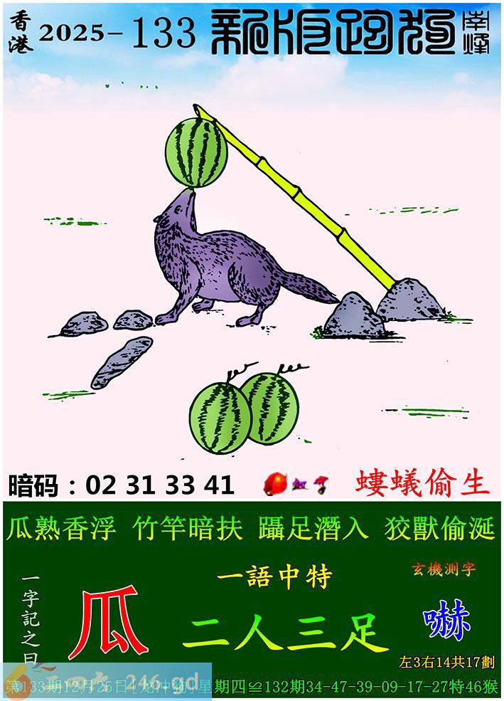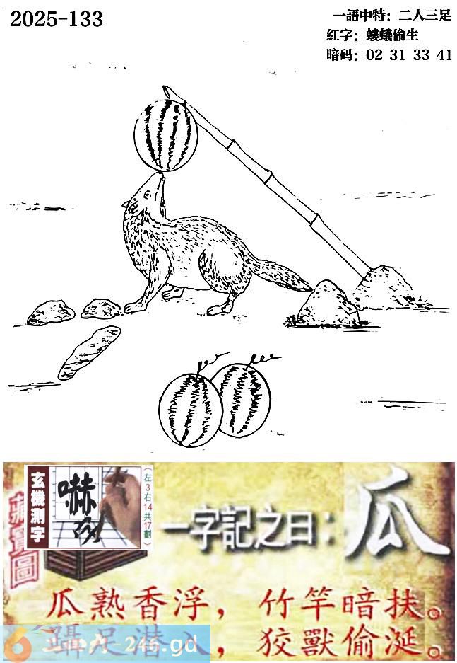 133期跑狗一字記之曰:【瓜】 瓜熟香浮,竹竿暗扶。 躡足潛入,狡獸偷涎。