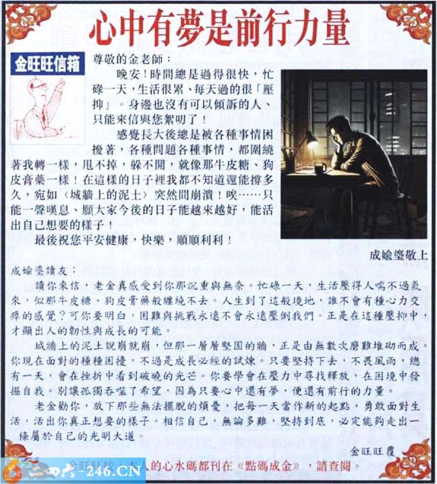 032期:金旺旺信箱彩民推荐→→《心中有夢是前行力量》