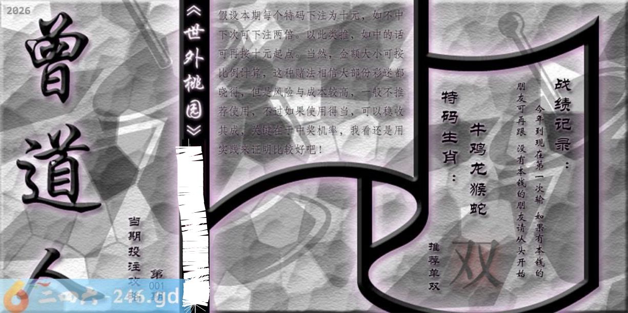 001期藏寶圖 新:郊外黄垓端可厌 老:晴街春色香车立 禁:虎 禁:0尾 玄機字:《育》