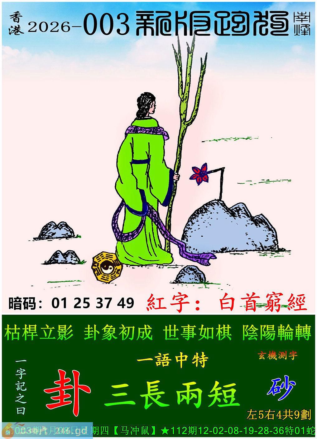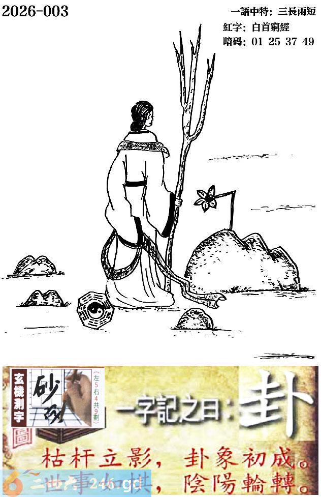 003期跑狗一字記之曰:【卦】 枯桿立影,卦象初成。 世事如棋,陰陽輪轉。