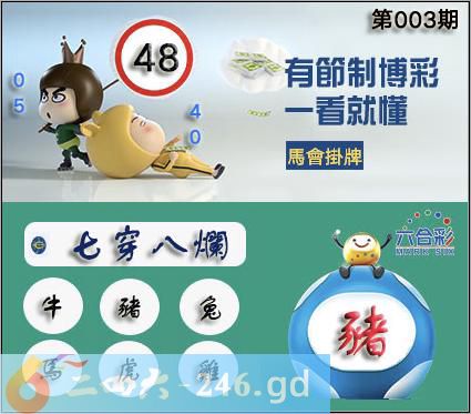 003期正版彩图挂:48 爆:猪 挂牌成语:七穿八烂 挂牌出肖:牛猪兔马虎鸡