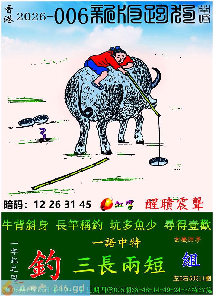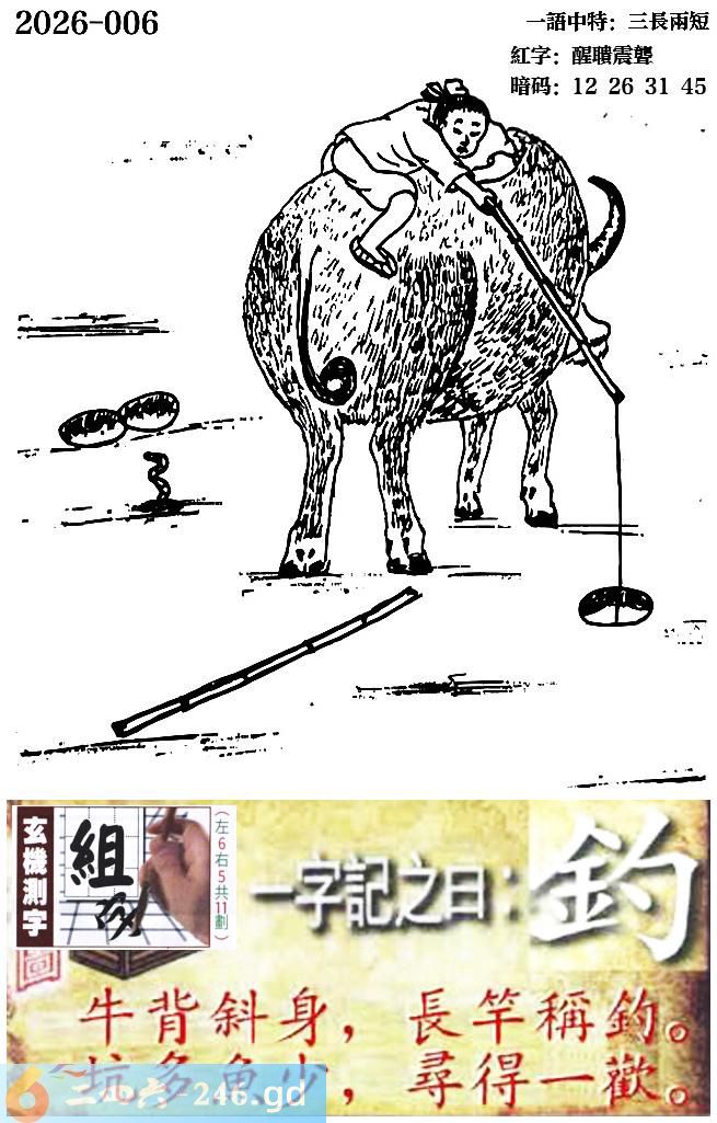 006期跑狗一字記之曰:【釣】 牛背斜身,長竿稱釣。 坑多魚少,尋得壹歡。