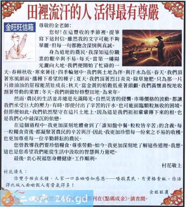 006期:金旺旺信箱彩民推荐→→《田裡流汗的人活得最有尊嚴》