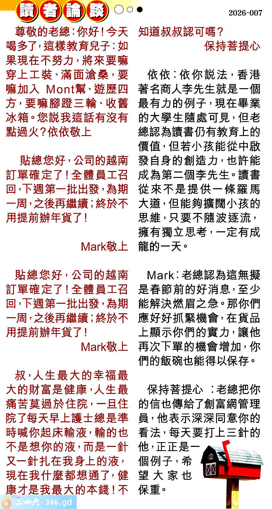 貼總您好,公司的越南訂單確定了!全體員工召回,下週第一批出發,為期一周,之後再繼續;終於不用提前辦年貨了!敬上