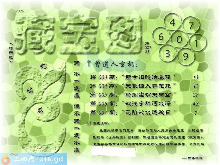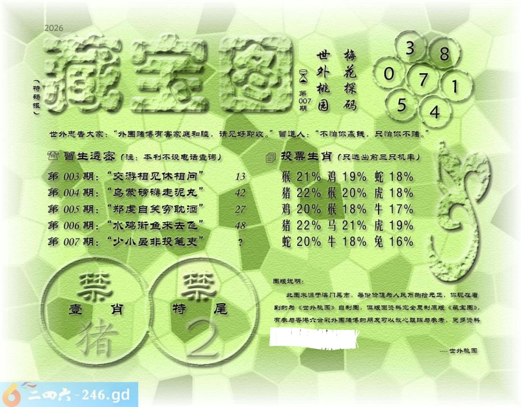 007期藏寶圖 新:已陪沁水追欢日 老:少小虽非投笔吏 禁:猪 禁:2尾 玄機字:《空》