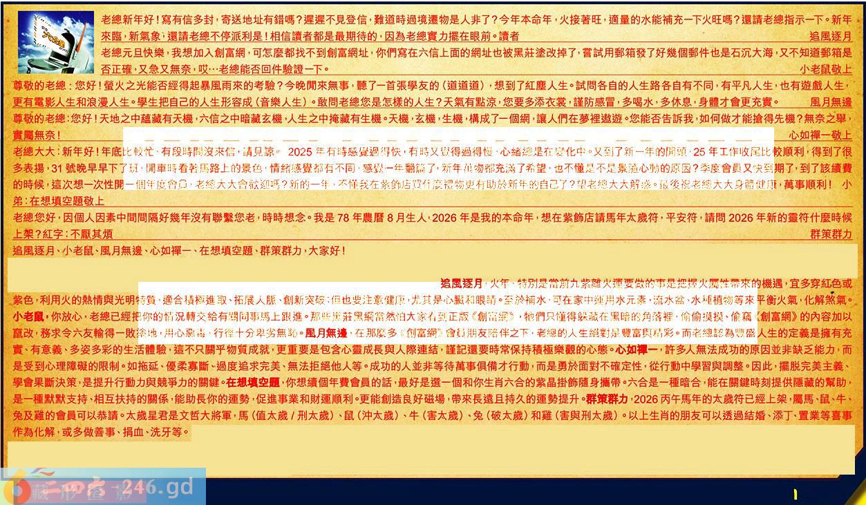 【1】.老總新年好!寫有信多封,寄送地址有錯嗎?遲遲不見登信,難道時過境遷物是人非了?今年本命年,火接著旺,適量的水能補充一下火旺嗎?還請老總指示一下。新年來臨,新氣象;還請老總不停派利是!相信讀者都是最期待的,因為老總實力擺在眼前。讀者追風逐月