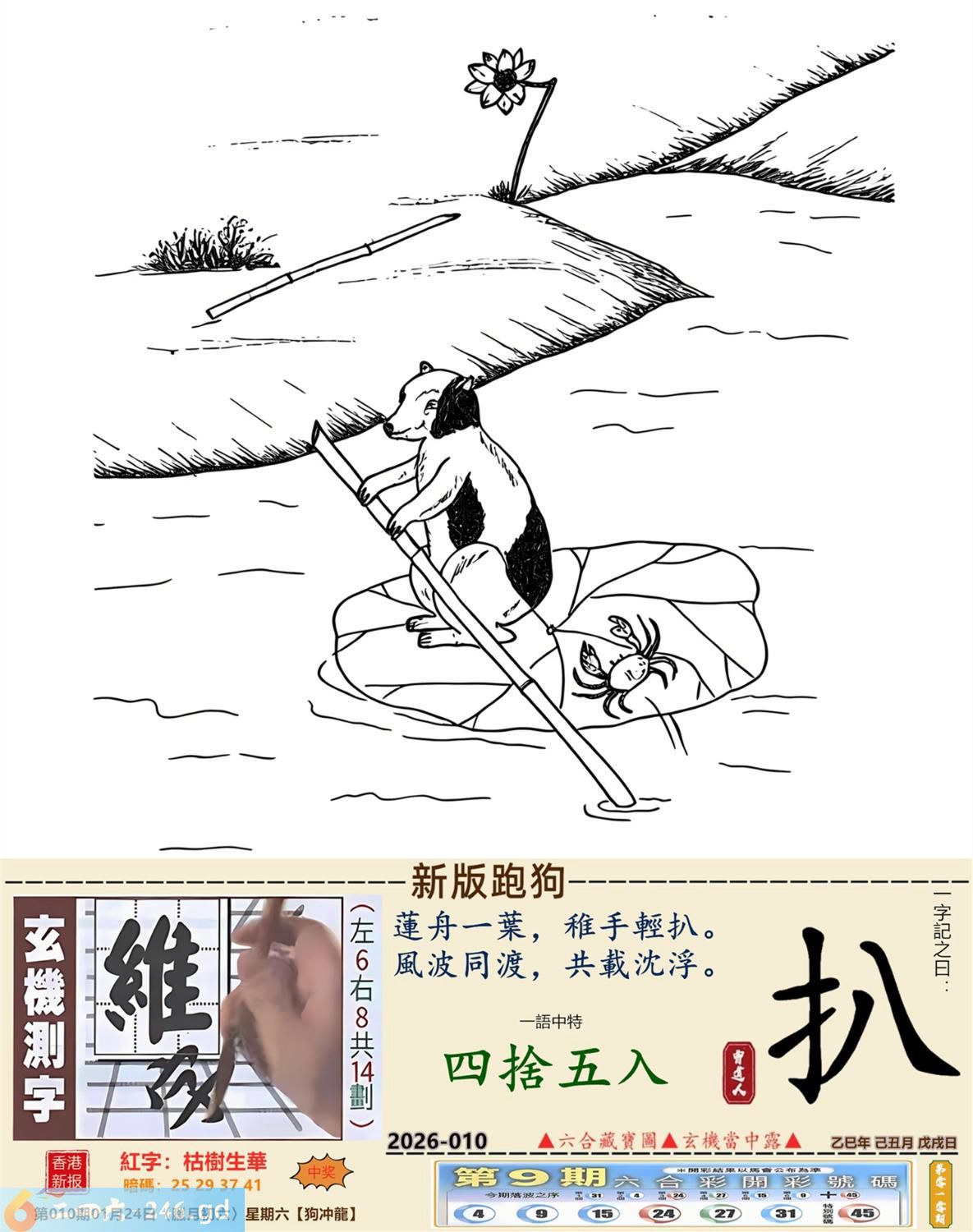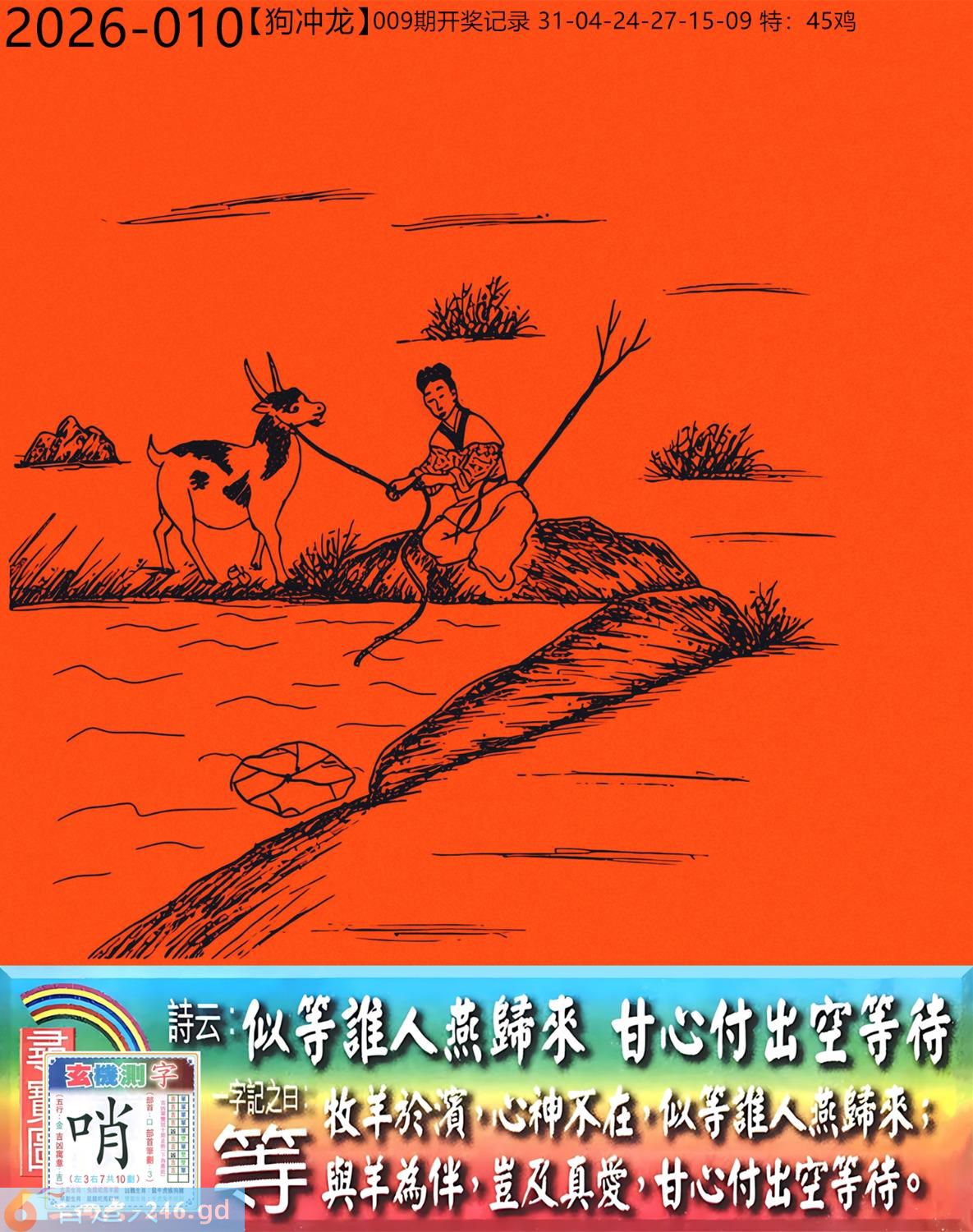 2026年1月24日010期龙(壬辰)(平地木) 010期:老版跑狗玄機一字記之曰:【等】 詩云:似等誰人燕歸來甘心付出空等待 牧羊於濱,心神不在,似等誰人燕歸來; 與羊為伴,豈及真愛,甘心付出空等待。 玄機測字:《哨》 密圖詩:山中無老虎 《記》:三門自有九尾數 特碼大小單雙句:抱着老婆暖被窩 今期必中:貂禪 010期:特碼歇后語 枣木疙瘩-----越老越结实 010期正版四字梅花诗:大张旗鼓。 010期火车头:烧伤马。诗:羊死龙伤,四书五经读一生。 010期香港第一手欲钱料:火。 010期曾道人说:“九?” 010期另版四字梅花诗:新春多福。 010期香港第一手欲钱料:欲钱找红色的动物。 010期曾道人说:“为什么春节期间家家户户都要放鞭炮呢”? 010期:二字經:深村 010期:路口有特码 010期:智力金壤; 010期:信箱紅字:【枯樹生華】 010期:【暗碼:25-29-37-41】 010期:一語中特:【四捨五入】 發財玄機圖:舐犢情深體型龐大圖中明牛藍綠 010期:藏寳圖 新:同向尘中叁拾载 老:秋槐叶落空宫里 禁:虎禁:1尾玄機字《辑》 2026年010期【生活幽默】版 〖分家産〗 一個富人快死了,分别给兩個兒子一把很鈍柴刀,説你們去砍一天的柴,誰砍的柴多,我就把家都給他。 大兒子拿了柴刀,急匆匆就上山砍柴去了。 二兒子拿過刀看了看,找了一把磨刀石,開始磨刀。 没過一會兒磨好了,拿着刀進屋對老爸説:"快把錢都拿出來!"