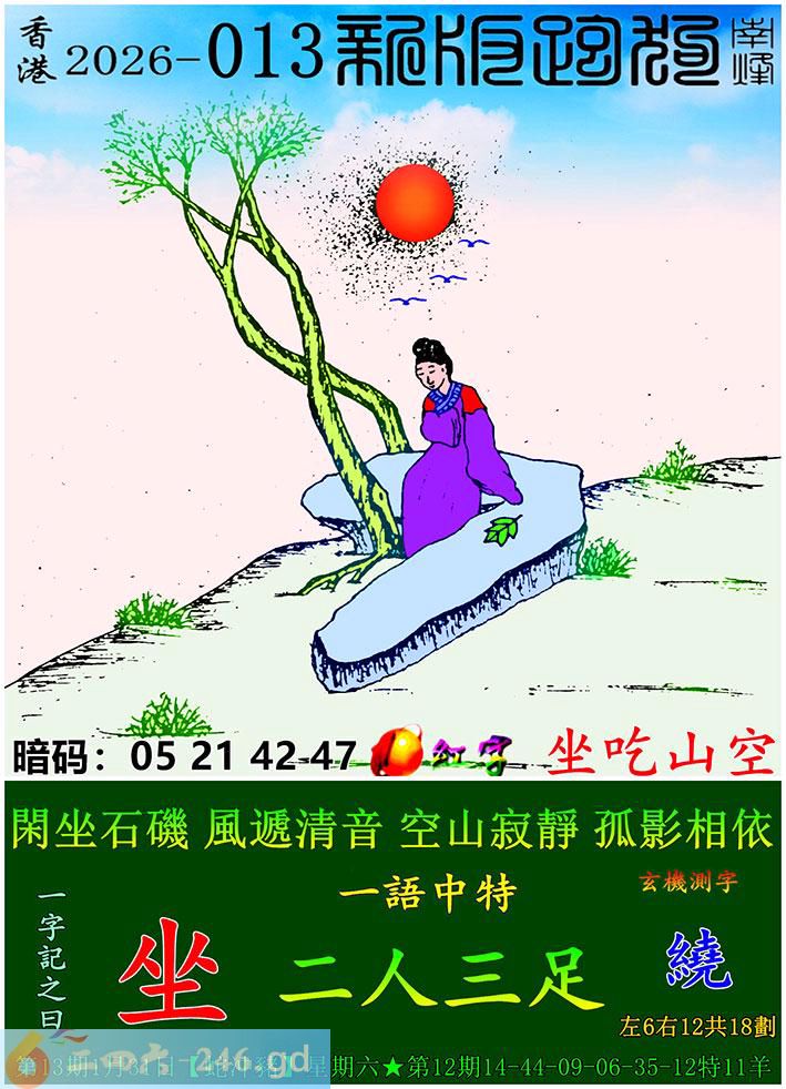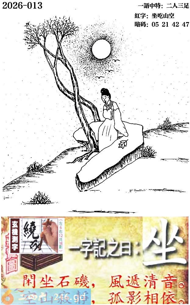 013期跑狗一字記之曰:【坐】 閑坐石磯,風遞清音。 空山寂靜,孤影相依。