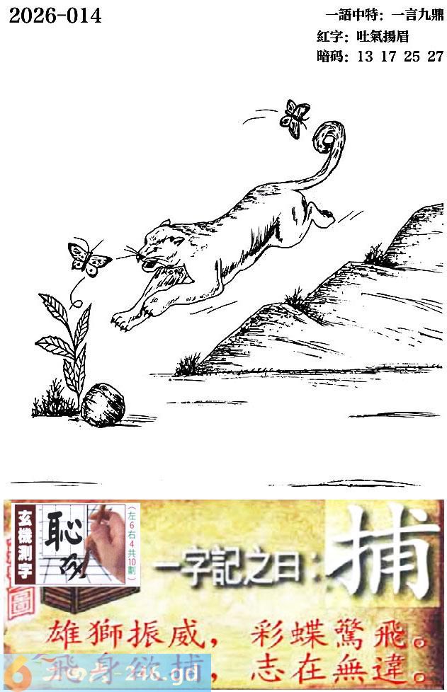 014期跑狗一字記之曰:【捕】 雄獅振威,彩蝶驚飛。 飛身欲捕,誌在無違。