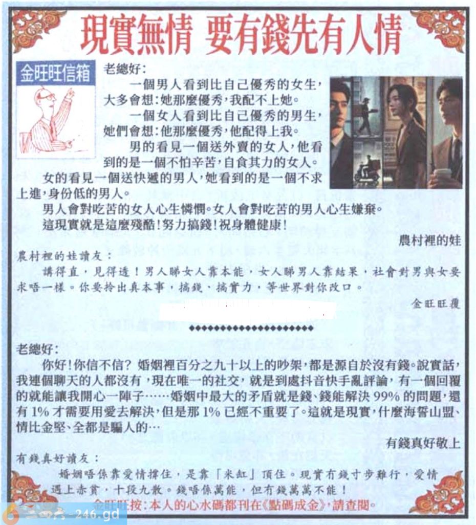 017期:金旺旺信箱彩民推荐→→《現實無情 要有錢先有人情》