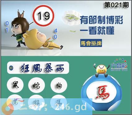 021期正版彩图挂:19 爆:马 挂牌成语:狂风暴雨 挂牌出肖:鼠蛇狗虎猴马