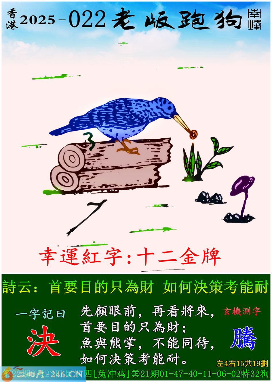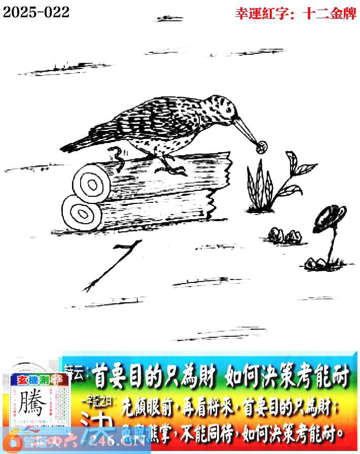 022期老版跑狗一字記之曰:【決】 詩雲:首要目的只為財,如何決策考能耐。
